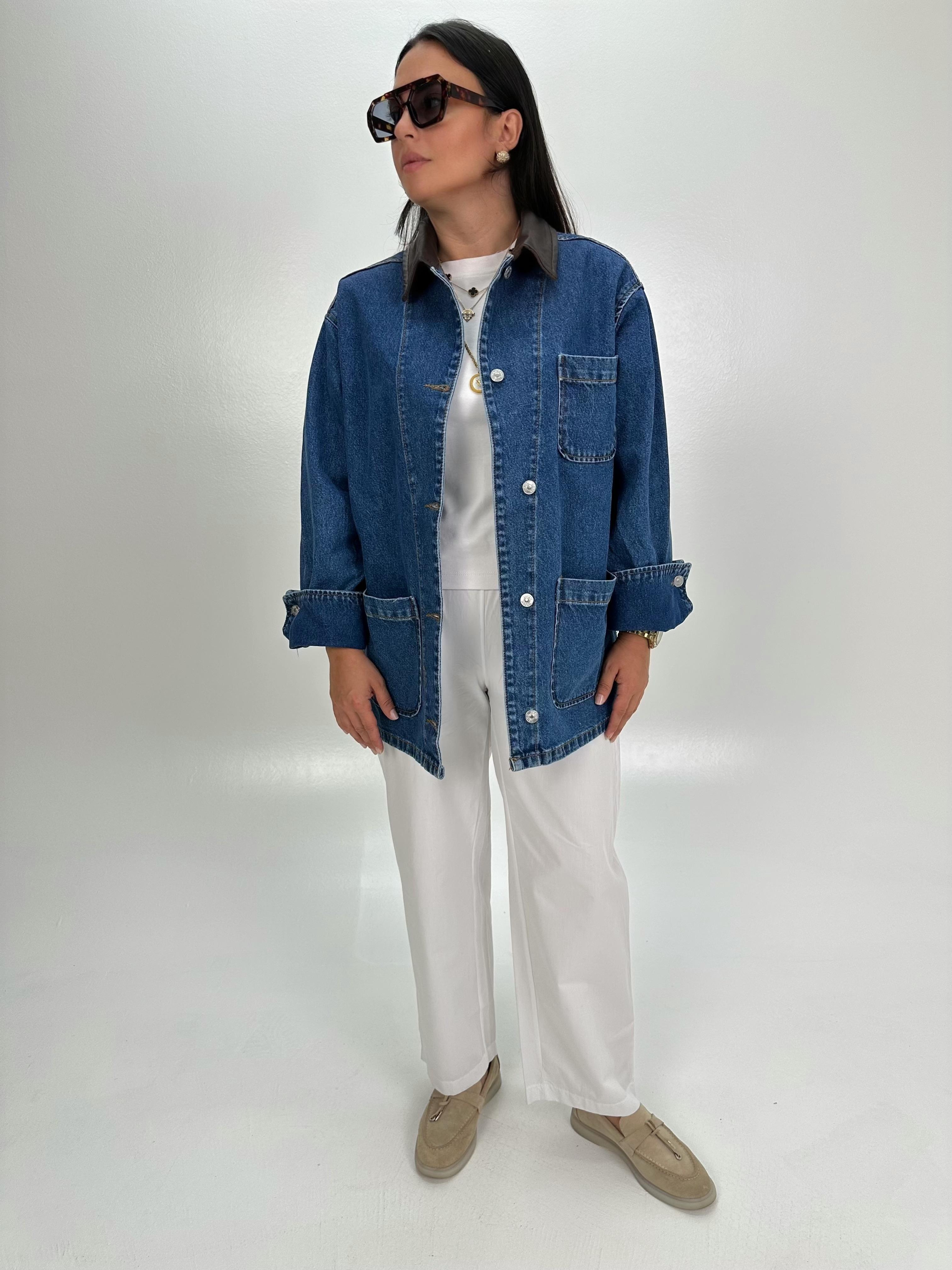 MAVİ YIKAMALI,DERİ YAKA DETAYI,METAL DÜĞMELİ,CEPLİ,KOL DETAYLI DENİM CEKET,ARA BOY