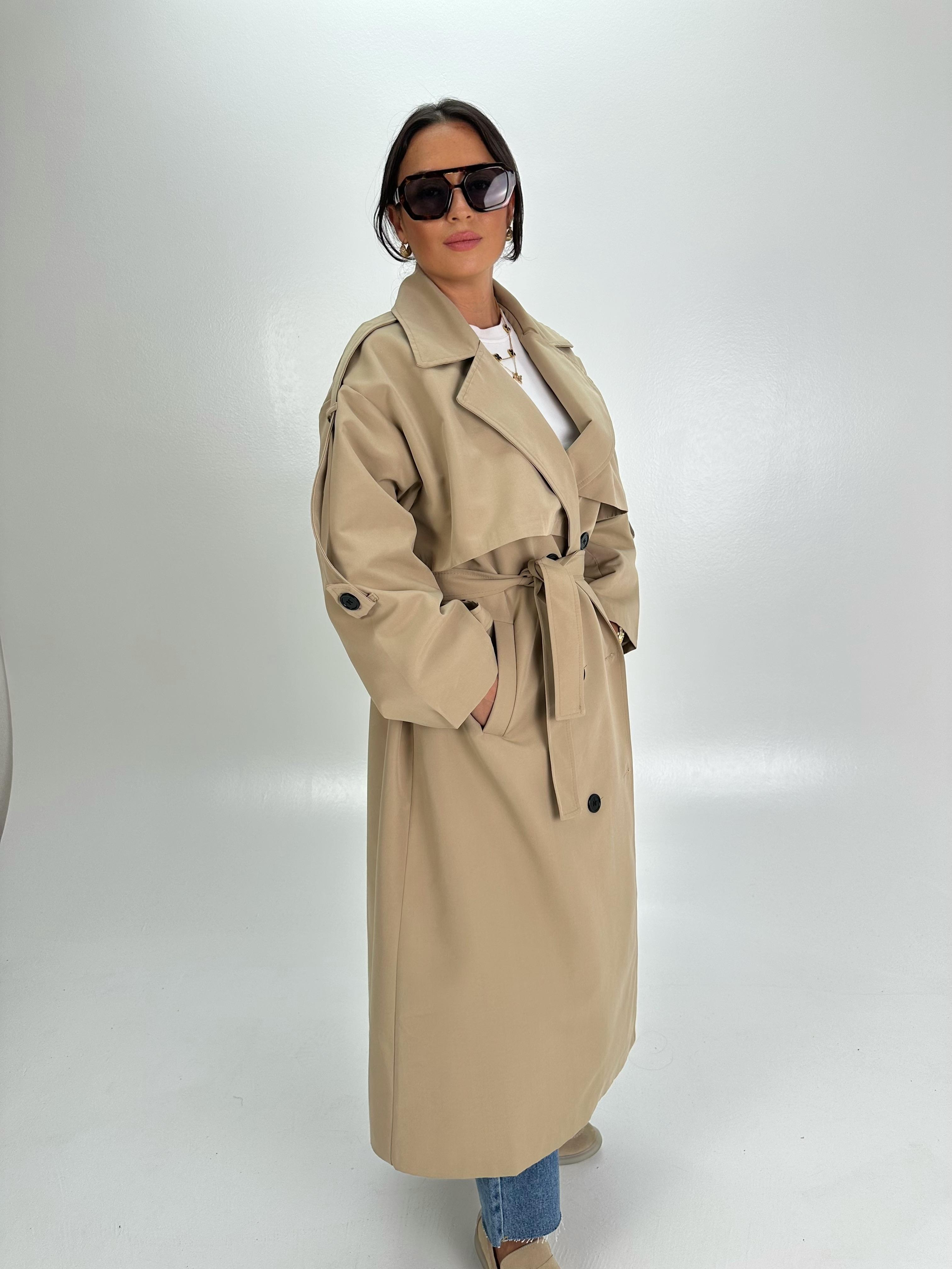 UZUN KOLLU,GENİŞ KATLI,OMUZ VE KOLLARI KEMER DETAYLI,ÖNÜ DÜĞMELİ,KUŞAKLI,ASTARLI TRENÇKOT